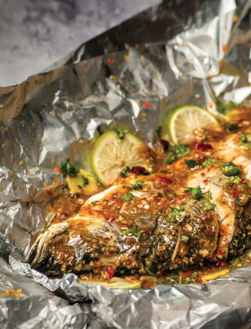 সসের ক্ষেত্রে চিকেন বা ফিশ স্টক চুলায় বসিয়ে জ্বাল দিন। বলক এলে এতে ব্রাউন সুগার যোগ করুন। চিনি গলে গেলে রসুনকুচি, কাঁচা মরিচের কুচি, লাল মরিচের কুচি, ফিশ সস, লেবুর রস ও ধনেপাতা দিয়ে নেড়ে নামিয়ে নিন। এই সস সেদ্ধ করে রাখা মাছের ওপর ঢেলে আবারও ধনেপাতা ছড়িয়ে পরিবেশন করুন।