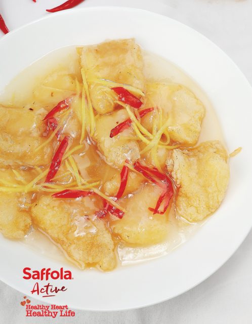 মাছের টুকরাগুলো ২ চা চামচ লবণ দিয়ে মাখিয়ে ১/২ ঘণ্টা পানিতে ডুবিয়ে রাখুন। পরিষ্কার পানিতে মাছ ধুয়ে পানি ঝরিয়ে নিন। এবার মাছের টুকরাগুলো ১ টেবিল চামচ শুকনা অ্যারারুট, ডিমের সাদা, ১/২ চা চামচ ফিশ সস আর ১/২ চা চামচ সেসমি অয়েল দিয়ে মাখিয়ে নিন। কড়া আঁচে তেল গরম করুন। ডুবো তেলে হালকা করে মাছের স্লাইস আলাদা করে এমনভাবে ভেজে তুলে রাখুন, যাতে ভাজা মাছের টুকরোগুলো চকচকে দেখায়। কিছুতেই কড়া ভাজা চলবে না। আলাদা কড়াইয়ে ৩ টেবিল চামচ তেল দিয়ে তাতে আদা রসুন স্লাইস হালকা করে ভাজুন। সবজি ও ভাঁজখোলা পেঁয়াজ দিয়ে ৩ থেকে ৪ মিনিট হালকা ভেজে নিন। সবজিতে ২ টেবিল চামচ গোলানো অ্যারারুট ও ১ কাপ পানি দিন। পানি ফুটে উঠে ঝোল ঘন হলে ভাজা মাছের টুকরা দিয়ে আলতো করে নাড়ুন। নামানোর আগে ২ চা-চামচ সেসমি অয়েল ছিটিয়ে পাত্রে সাজিয়ে পরিবেশন করুন।
