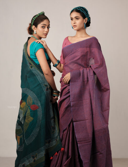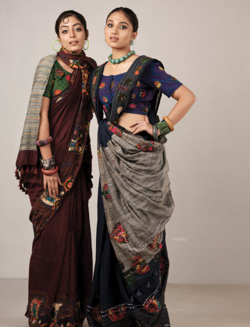 সুতোয় বোনা কারুকাজ। মনের মাধুরী মেশানো মোটিফ। আঁচলে আনকোরা স্টাইলিং। গাঢ় দুই রঙে ধরণি প্রেমের উদ্ভাসন