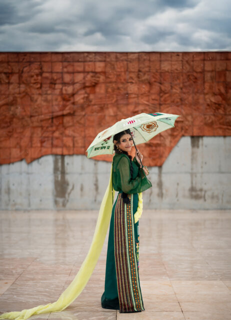 বাংলাদেশের ঐতিহ্য ও সাংস্কৃতিক পরিচয় সমুন্নত রাখার উদ্দেশ্যে তরুণ ডিজাইনার রাইসা আমিন শৈলী তৈরি করেছেন হাই-ফ্যাশন ফিউশন শাড়ি। তার মতে, এই শাড়ি শুধু পোশাক নয়; ঐতিহ্য রক্ষার ভিজ্যুয়াল প্রতিবাদও। বারবার বাংলাদেশের ভৌগোলিক নির্দেশক হিসেবে চিহ্নিত পণ্যকে অন্য দেশ তাদের বলে দাবি করেছে। তাই এ দেশের এই বিশেষ ক্ষেত্রগুলো সমস্যার সম্মুখীন হয়েছে। প্রতিবাদস্বরূপ নিজের নকশার শাড়িতে তুলে এনেছেন সেসব নান্দনিক পণ্য। শাড়ি তৈরিতেও ব্যবহার করা হয়েছে জিআই স্বীকৃত উপাদান। নকশিকাঁথায় করা হয়েছে অলংকরণ। মোটিফে ফুটে উঠেছে রয়েল বেঙ্গল টাইগার, শহীদ মিনার, পুরোনো মুদ্রা, জামদানি, ইলিশ, রাতাবোরো ধান, মধুপুর আনারস, ক্ষীরশাপাতি আম ও মসলিন। ডিজাইনের অংশ হিসেবে একটি প্রতীকী ছাতা তৈরি হয়েছে রাজশাহীর সপুরার সিল্কে। এতে যুক্ত হয়েছে জাতীয় পতাকা, ভাষা আন্দোলনের প্রতীক, রিকশা আর্ট, দশ পয়সার মুদ্রা ও ‘মাছে-ভাতে বাঙালি’ লেখা। সবুজ, সোনালি ও নীল রঙে শাড়িটি উপস্থাপন করেছে বাংলাদেশের প্রকৃতি, উর্বরতা ও সমৃদ্ধি। পুরো কাজ শেষ করতে সময় লেগেছে দুই মাস।