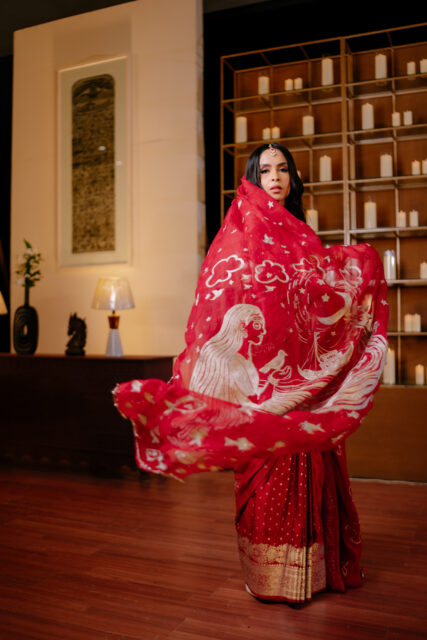 ফ্যাশন ডিজাইনার আফসানা ফেরদৌসি এবং ভিজ্যুয়াল আর্টিস্ট সৌরভ চৌধুরী কোলাবোরেশনে তৈরি করেছেন ব্রাইডাল কালেকশন; যা শুধু পোশাক নয়, বরং গল্প, কবিতা ও আর্টওয়ার্কেরও সংমিশ্রণ। এই কালেকশনের মূল আকর্ষণ হলো ভেইল, যেখানে জীবনানন্দ দাশের ‘বনলতা সেন’ কবিতা অনুপ্রাণিত একটি আর্টওয়ার্ক ফুটে উঠেছে। সেখানে বনলতা সেনকে টেপা পুতুল আঙ্গিকে করা হয়েছে উপস্থাপন। তার চুল সমুদ্রের ঢেউয়ে ছড়িয়ে, তরঙ্গে ভেসে থাকা নৌকা, মাছ, পাখি, চাঁদ ও তারা ফুটিয়ে তুলেছে। আফসানা বলেন, ‘আমাদের লক্ষ্য ছিল কেবল কনের জন্য নয়; বরং ভবিষ্যৎ প্রজন্মের জন্যও বাংলাদেশের ঐতিহ্যকে ধরে রাখা।’ এতে আর্টওয়ার্ককে আড়ি এমব্রয়ডারির মাধ্যমে কাপড়ে ফুটিয়ে তোলা এবং কবিতার অংশকে হাতে লেখা ও মোটিফ আকারে অন্তর্ভুক্ত করা হয়।