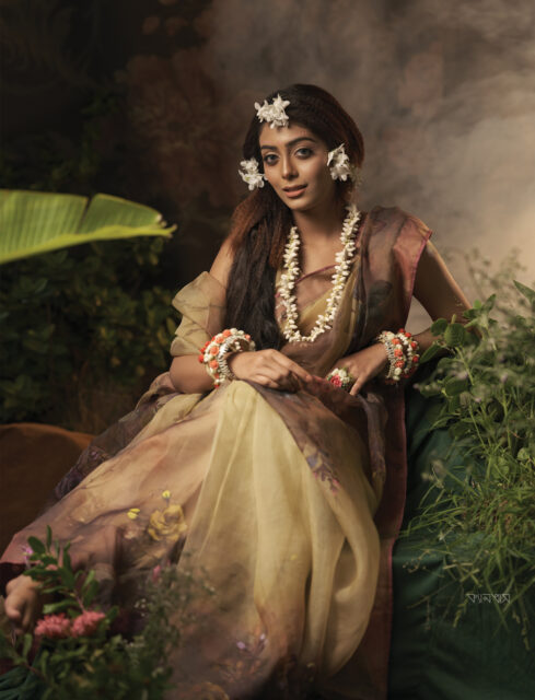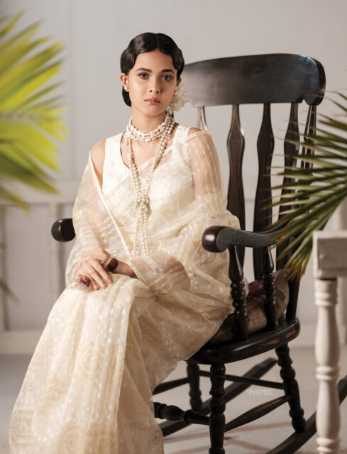 রবীন্দ্রনাথ ঠাকুরের ‘নষ্টনীড়’ গল্পের নায়িকা। কাঠগোলাপের রং থেকে প্রাণিত শাড়ি। মুক্তার গয়নায় স্নিগ্ধতার মোহ। খোঁপায় জুঁই ফুল। মিনিমাল মেকআপের ম্যাজিক। সুবিন্যস্ত, সাধারণ, মার্জিত; তবু যেন স্বর্গের অপ্সরা। আপাত-নিঃসঙ্গ সে। নিশিদিন কাটে মনোযোগের অপেক্ষায়। জামদানির মোলায়েম জমিনে নিশ্চিন্তি, নির্ভয়। চোখে চঞ্চলতা লুকিয়ে আছে শান্ত দীঘির মতো। দস্যি মেয়ের পায়ে বেড়ি পরানো যেন