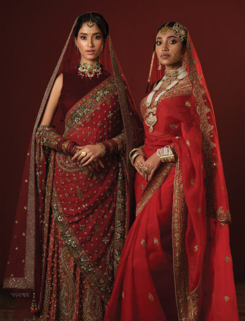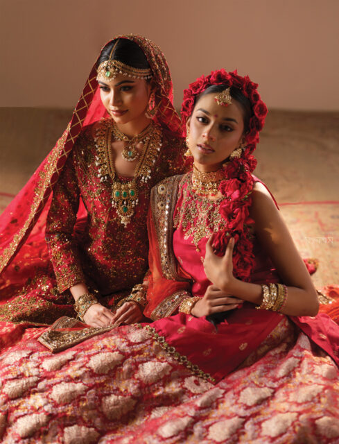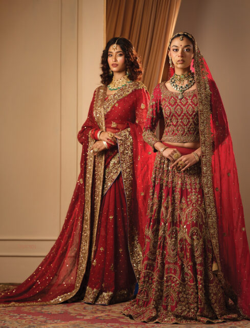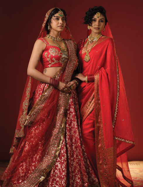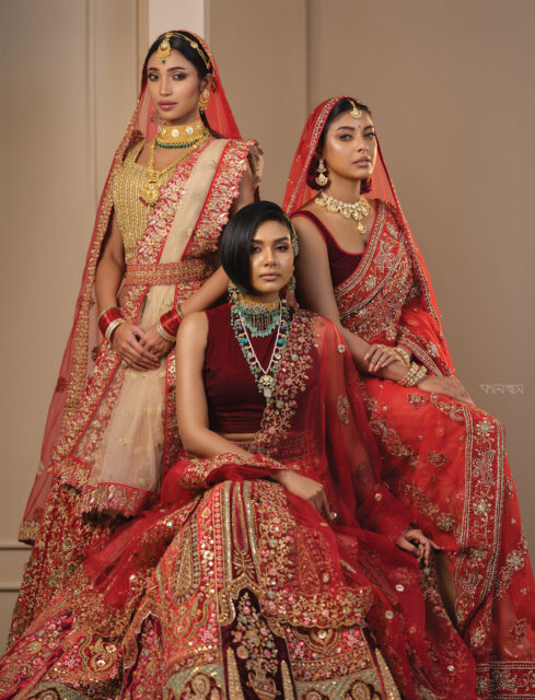 রক্তরাগের উদ্ভাসন। টকটকে লাল আর তাতে সোনালি কাব্যের জমকালো উপস্থাপন। শাড়ি আর লেহেঙ্গা—উভয়ই আছে। সঙ্গতে ঘোমটার জমকালো আয়োজন