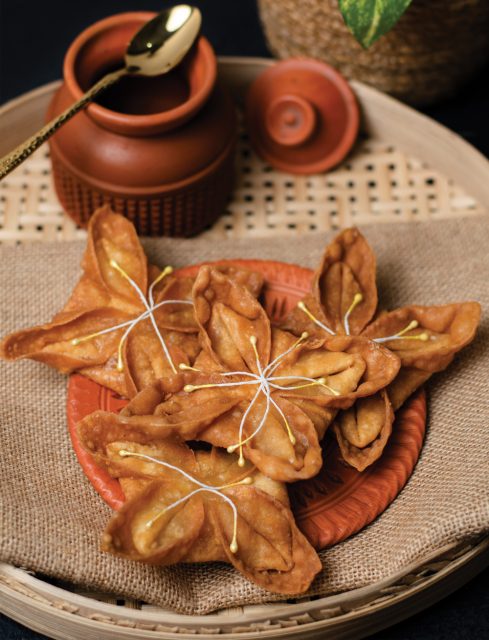 মণ্ড থেকে ছোট ছোট লেচি নিন। মুঠো আকারে ফুলের মতো করে ৪-৫ পাপড়ির ছোট আকৃতি বানান। এবার দেখতে ফুলের আকার পাবে। চাইলে মাঝখানে টুথপিক দিয়ে সামান্য দাগ টেনে দিতে পারেন।
