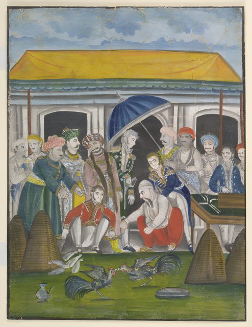 আওধের নবাব আসাফ-উদ-দৌলা ইউরোপীয় কর্মকর্তাদের সঙ্গে মুর্গবাজিতে মত্ত। লখনৌয়ের কোনো এক নাম না জানা দরবারি শিল্পী এটি এঁকেছিলেন ১৮৩০ থেকে ১৮৩৫ সালের মধ্যে। এটি সম্ভবত ১৭৮৬ সালে অনুষ্ঠিত কর্নেল মোর্দা ও নবাবের মোরগের মধ্যকার লড়াই দেখাচ্ছে