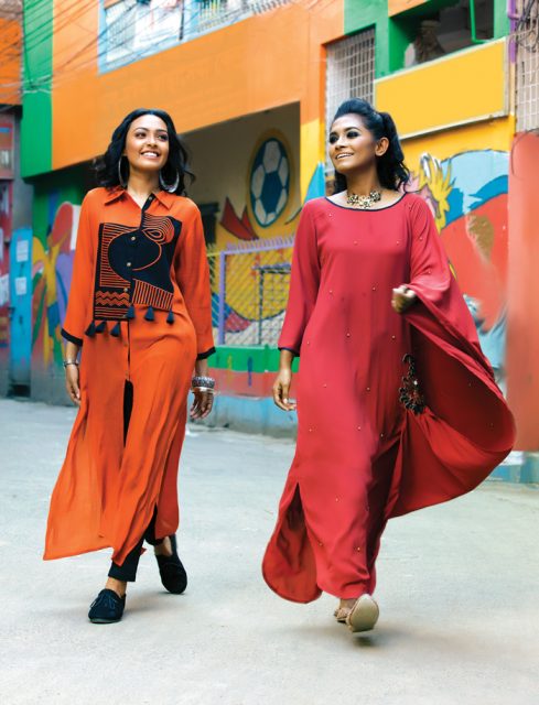 রেডিশ অরেঞ্জ কুর্তিতে অলওভার এমব্রয়ডারি