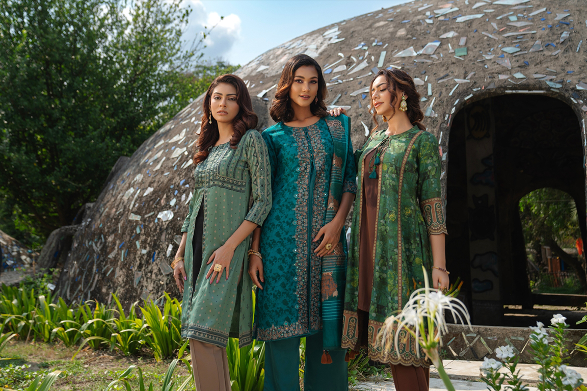 তিনি আরও জানান, চলতি গ্রীষ্ম ও বর্ষার কথা মাথায় রেখে আরামদায়ক ফ্যাব্রিক বেছে নেওয়া হয়েছে; যেমন সুতি, লিনেন, মসলিন ও শিফন। থাকছে সাবলীল কাট, ফ্লোয়ি সিলুয়েট এবং চলাফেরায় সহজতা এনে দেওয়া ডিজাইন। রঙের প্যালেটেও থাকছে আর্দি, বেজ ও নেভি প্যালেটের প্রাধান্য। সেন্টিমেন্ট কালার হিসেবে স্কাফড লেমন ও ওয়াশড ব্ল্যাকের অর্গানিক শেড, যেন সামার ও উৎসবের রঙে হালকা-গাড় শেডের ভারসাম্য বজায় থাকে। প্রাইমারি কালার প্যালেটে আর্মি গ্রিন, ব্ল্যাক, লাইট গ্রে, অফ হোয়াইট, কোকো ব্রাউন, টেরাকোটা, রেড, বার্ন অরেঞ্জ, ভায়োলেট-গ্রে, লাইট ল্যাভেন্ডার, অলিভ স্যান্ড, প্যাস্টেল ইয়েলো, ক্রিম, মাস্টার্ড ইয়েলো, চকোলেট ব্রাউন, স্লেট ব্লুর মতো শান্ত, মিষ্টি ও উজ্জ্বল রঙের সমাহার।’
