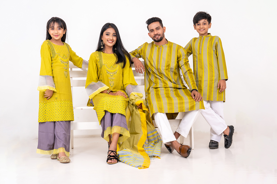 পিছিয়ে নেই ছোটরাও। তাদের জন্য সালোয়ার কামিজ, ফ্রক, টপস, পাঞ্জাবি, শার্টসহ রকমারি সব পোশাকের পাশাপাশি থাকছে বাবা-ছেলে, মা-মেয়ের ডুয়েট পোশাক, ম্যাচিং করা কাপল পোশাক আর পুরো পরিবারের জন্য ফ্যামিলি প্যাকেজ।