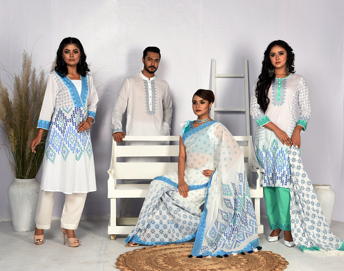 বাংলার প্রকৃতিতে আবির্ভূত শরৎকাল। আকাশে যেন হালকা মেজাজের সাদা মেঘের পোশাকের সাজ। ঋতুর এই বৈচিত্র্যকে মাথায় রেখে প্রতি বছরই বিশেষ পোশাকের আয়োজন করে আসছে কে ক্র্যাফট। নীল আর সাদার সম্মিলন প্রাধান্য পেয়েছে এই সংকলনে।