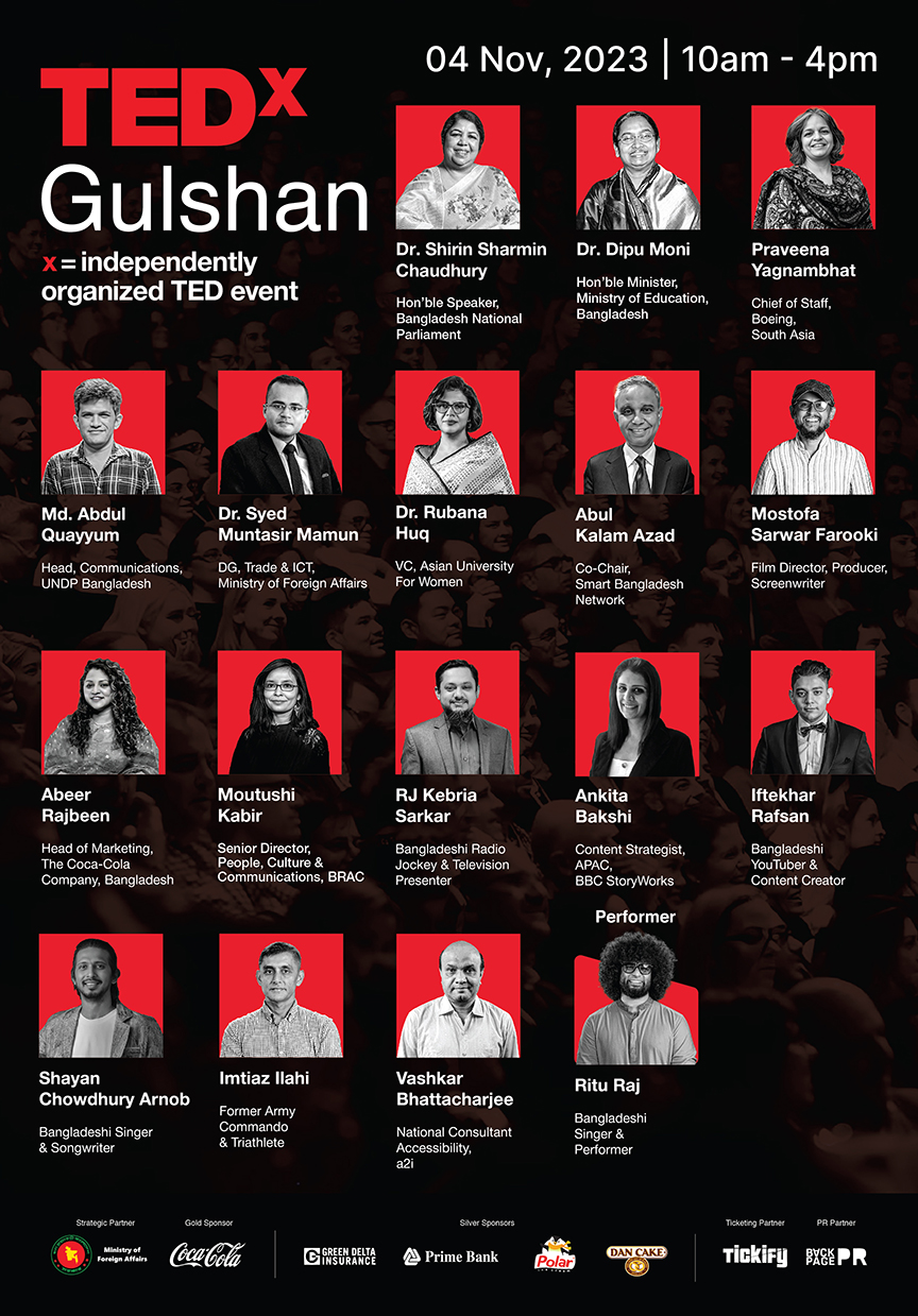 এবারের টেড-এক্স গুলশানে শিরীন শারমিন চৌধুরী ও দীপু মনির পাশাপাশি আরও কথা বলবেন বোয়িং দক্ষিণ এশিয়ার চিফ অব স্টাফ প্রবীণা ইয়াগামভাত; স্মার্ট বাংলাদেশ নেটওয়ার্ক-এর কো-চেয়ার ও সাবেক মুখ্য সচিব আবুল কালাম আজাদ; ইউএনডিপি বাংলাদেশ-এর হেড অব কমিউনিকেশনস মো. আব্দুল কাইয়ুম; পররাষ্ট্র মন্ত্রণালয়ের আন্তর্জাতিক বাণিজ্য, বিনিয়োগ ও আইসিটি বিষয়ক মহাপরিচালক সৈয়দ মুনতাসির মামুন; এশিয়ান ইউনিভার্সিটি ফর উইমেনের ভাইস চ্যান্সেলর রুবানা হক; বাংলাদেশি গায়ক ও গীতিকার শায়ান চৌধুরী অর্ণব; চলচ্চিত্র পরিচালক মোস্তফা সরয়ার ফারুকী; কোকা-কোলা কোম্পানি, বাংলাদেশ-এর হেড অব মার্কেটিং আবীর রাজবীন; এটুআই-এর ন্যাশনাল কনসালটেন্ট অ্যাক্সেসিবিলিটি ভাস্কর ভট্টাচার্য; বাংলাদেশি রেডিও জকি ও টেলিভিশন উপস্থাপক কিবরিয়া সরকার; অ্যাপেক, বিবিসি স্টোরি ওয়ার্কস-এর বিষয়বস্তু কৌশলবিদ অঙ্কিতা বক্সী; বাংলাদেশি ইউটিউবার ও কনটেন্ট ক্রিয়েটর ইফতেখার রাফসান; প্রাক্তন সেনা কমান্ডো ও ট্রায়াথলিট ইমতিয়াজ ইলাহী; এবং ব্র্যাকের সিনিয়র ডিরেক্টর (পিপল, কালচার অ্যান্ড কমিউনিকেশনস) মৌটুসী কবির।