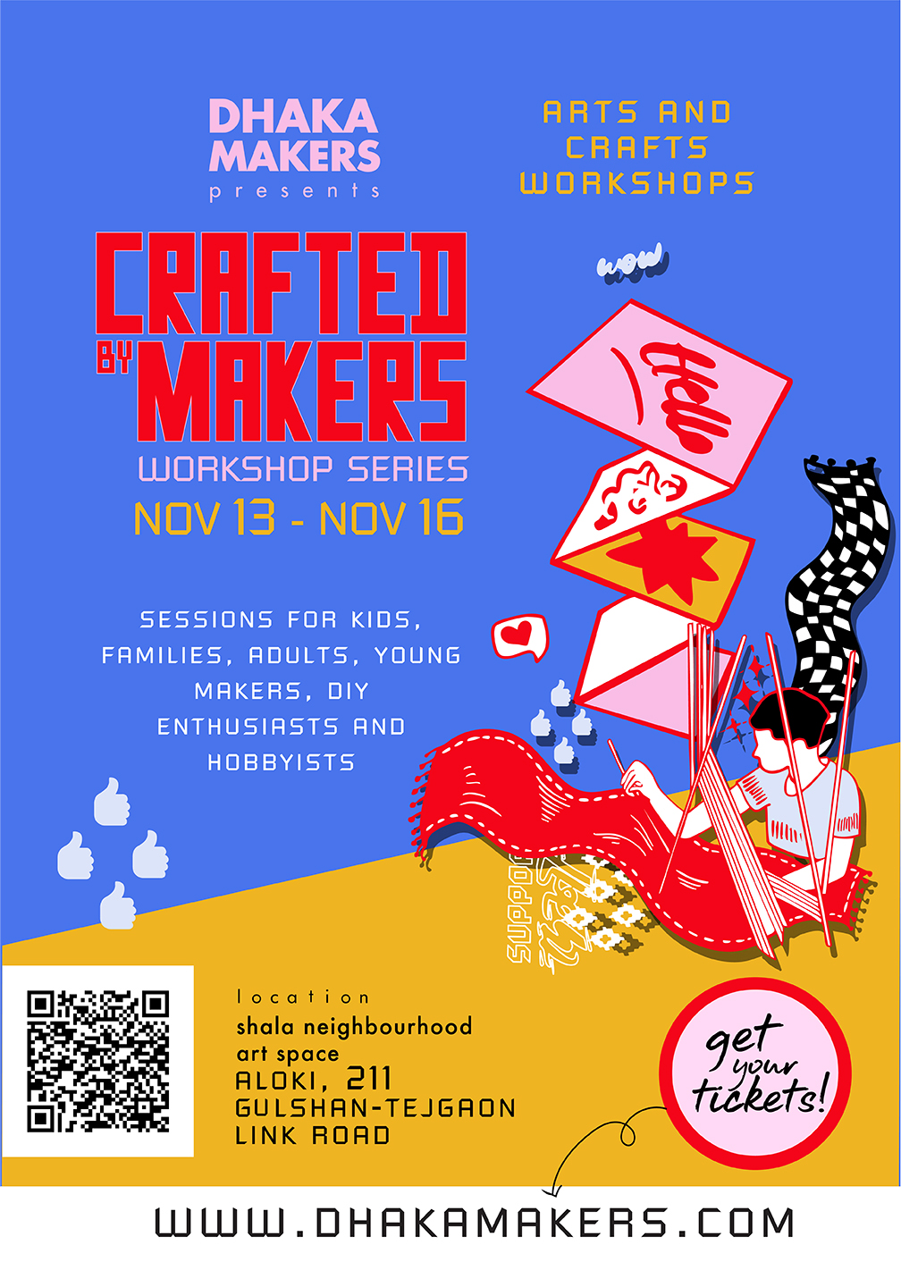 আয়োজকদের ভাষ্য, ঢাকা মেকারস সব সময় বিশ্বাস করে, সৃষ্টিশীলতা মানেই উৎসব। ওয়ার্কশপ সিরিজের মাধ্যমে উৎসবের চেতনাকে বিলিয়ে দিতে চায় ঢাকাবাসীর মনে। এখানে অংশগ্রহণকারীরা পাবেন কিউরেটেড ওয়ার্কশপ কিট, গাইডেড হ্যান্ডআউট, আর নিজের হাতে বানানো সৃষ্টিগুলো ঘরে নিয়ে যাওয়ার সুযোগ। অংশগ্রহণের জন্য ব্রাউজ করতে হবে www.dhakamakers.com ওয়েবসাইটে।