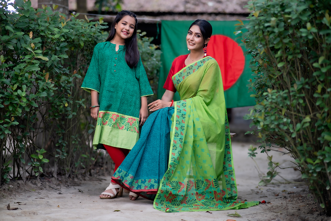 এই তিন প্রতীকের গল্পকেই রঙ বাংলাদেশ তুলে ধরেছে ডিজাইন, রং ও ফ্যাব্রিকের মেলবন্ধনে, যাতে প্রতিফলিত হয়েছে স্বাধীনতার আবেগ ও আধুনিকতার সংযোগ। লাল ও সবুজ রঙের সাহসী সমন্বয়ের মাধ্যমে প্রতিটি ডিজাইন যেন কথা বলে স্বাধীনতার, গর্বের, আত্মবিশ্বাসের। ব্যবহৃত ফ্যাব্রিকে এসেছে আরাম ও নান্দনিকতার সুষম মেলবন্ধন– কটন, হাইব্রিড কটন, জ্যাকার্ড কটন এবং হাফসিল্ক। এই কাপড়গুলো শুধু পোশাক নয়; যেন একেকটি ইতিহাসবাহী চিহ্ন– যেখানে ঐতিহ্য ও আধুনিকতার মিলন ঘটেছে অনবদ্যভাবে।