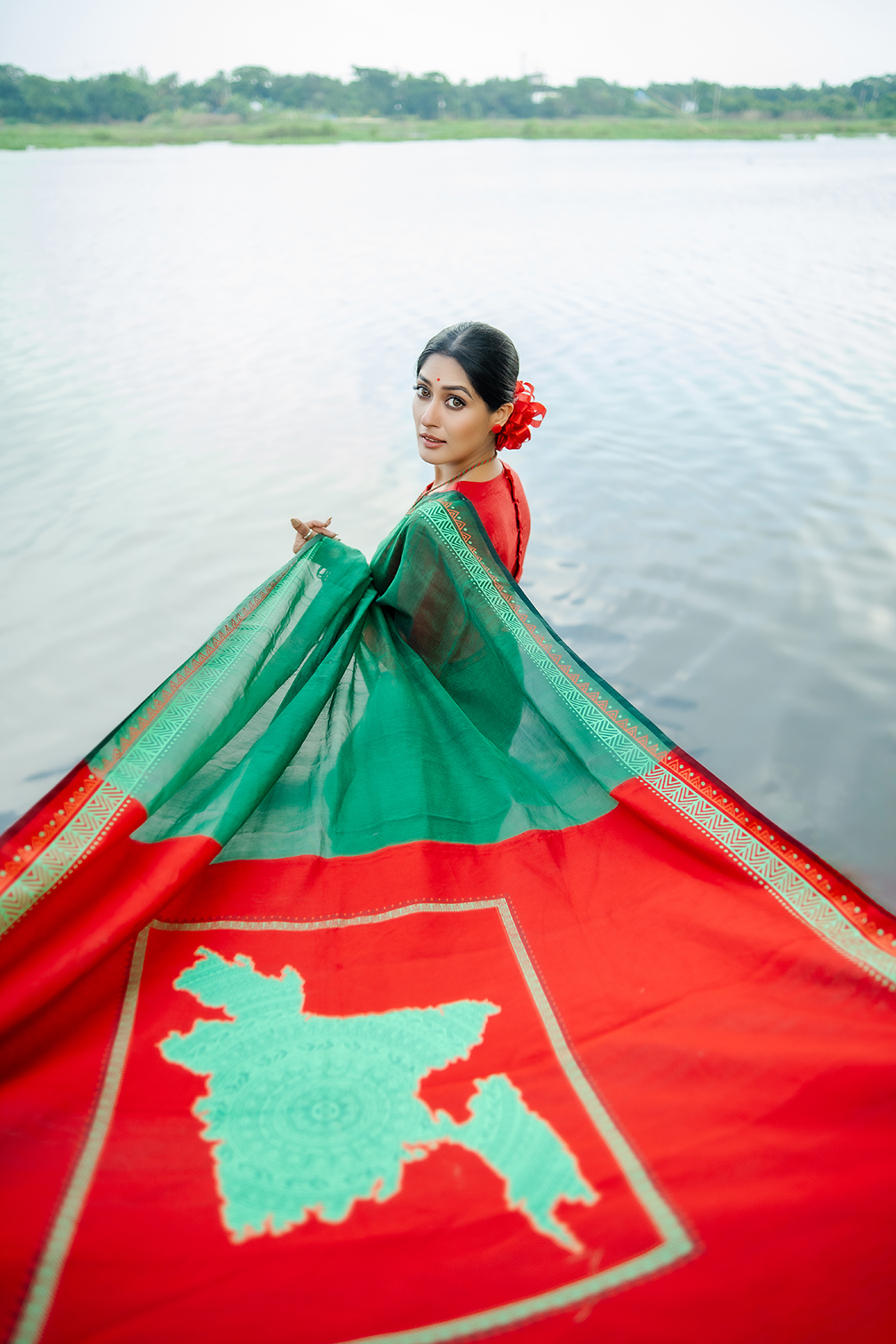 কাজে ব্যবহৃত হয়েছে স্ক্রিন প্রিন্ট ও ডিজিটাল প্রিন্ট, যেখানে একদিকে বাংলাদেশের মানচিত্র ফুটে উঠেছে শিল্পীর নিপুণ হাতে, অন্যদিকে জাতীয় সংগীতের পঙ্ক্তিগুলো যেন বাতাসে বাজে রঙিন ছন্দে। আর পতাকার লাল সূর্যের বৃত্ত ছড়িয়ে দিয়েছে বিজয়ের আগুনে দীপ্ত শক্তির প্রতীকী ইঙ্গিত। এই আয়োজনের প্রতিটি পোশাক যেন একেকটি ক্যানভাস, যেখানে ইতিহাস কথা বলে রঙে, দেশপ্রেম মিশে যায় নকশায়, আর বিজয়ের গান গেয়ে ওঠে প্রতিটি ফ্যাব্রিকের বুননে।