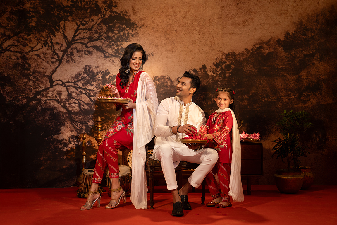 আরও আছে থ্রি-পিস। ঐতিহ্যের আভিজাত্য আর আধুনিক ডিজাইনের সেরা সমন্বয়ে। কটন, জর্জেট ও সিল্কের কোমল ছোঁয়ায় তৈরি এই পোশাকগুলো শুধু আরামদায়কই নয়, উৎসবের দিনকে করে তুলবে আরও গ্ল্যামারাস।