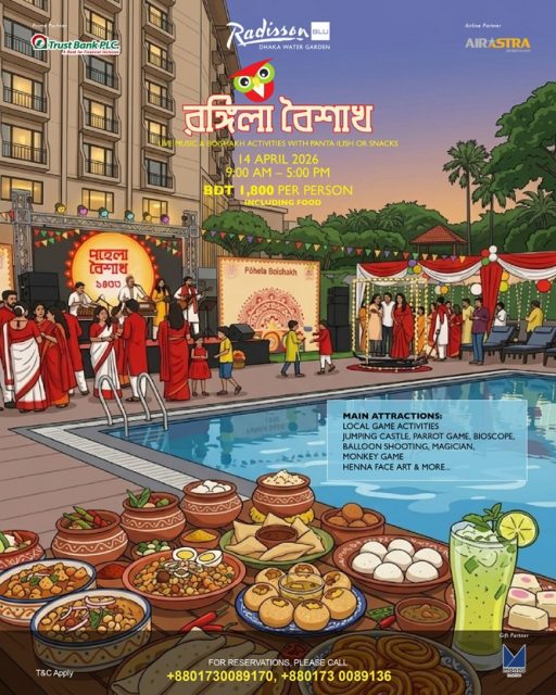 বাংলা নববর্ষ উপলক্ষে ১৪ এপ্রিল দিনব্যাপী ‘রঙিলা বৈশাখ’ উদ্যাপনের আয়োজন করা হয়েছে রাজধানীর র্যাডিসন ব্লু ঢাকা ওয়াটার গার্ডেনে। আয়োজনে অতিথিদের জন্য থাকবে ঐতিহ্যবাহী বাংলা খাবার, বিনোদনমূলক কার্যক্রম এবং উৎসবমুখর পরিবেশ।