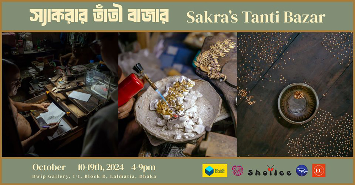 সেই চেনা তাঁতিবাজারের অচেনা গানের গল্পের ঝুড়ি নিয়ে গয়না শিল্পী, উদ্যোক্তা ও প্রশিক্ষক তাহমীনা শৈলীর আনন্দ প্রয়াস ‘স্যাকরার তাঁতিবাজার’। ১০ থেকে ১৯ অক্টোবর, বিকেল ৪টা থেকে রাত ৯টা লালমাটিয়ার দ্বীপ গ্যালারিতে চলবে এই প্রদর্শনী।