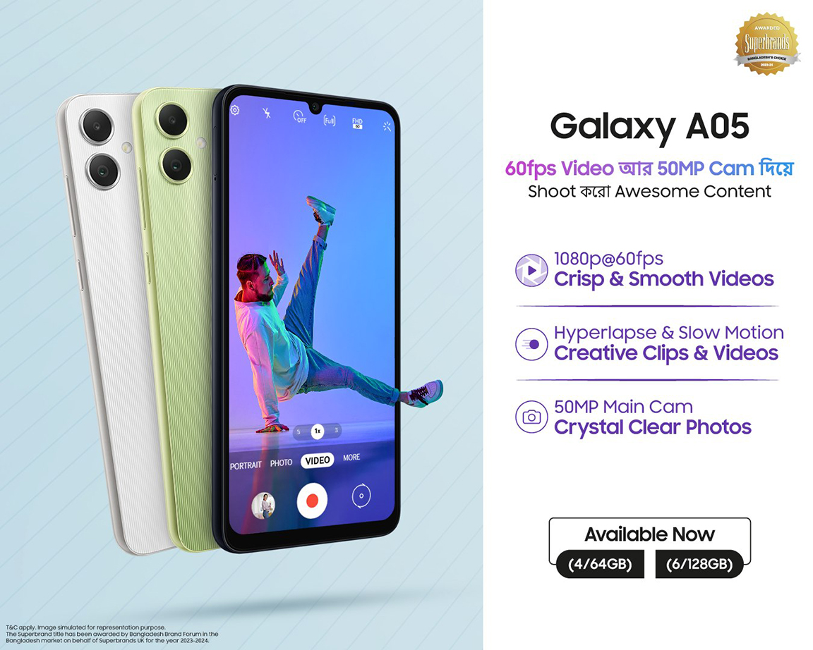 ‘অসাম’ সিরিজের সর্বশেষ সংযোজন গ্যালাক্সি এ০৫ দেশের বাজারে এনেছে স্যামসাং বাংলাদেশ। এক সংবাদ বিজ্ঞপ্তিতে বলা হয়, দুর্দান্ত ফটোগ্রাফি সক্ষমতা আর দীর্ঘস্থায়ী ব্যাটারির সমন্বয়ে নতুন এই ডিভাইস নিঃসন্দেহে ব্যবহারকারীদের স্মার্টফোনে কনটেন্ট দেখার ও ব্যবহারের অভিজ্ঞতাকে নতুন মাত্রায় পৌঁছে দেবে।