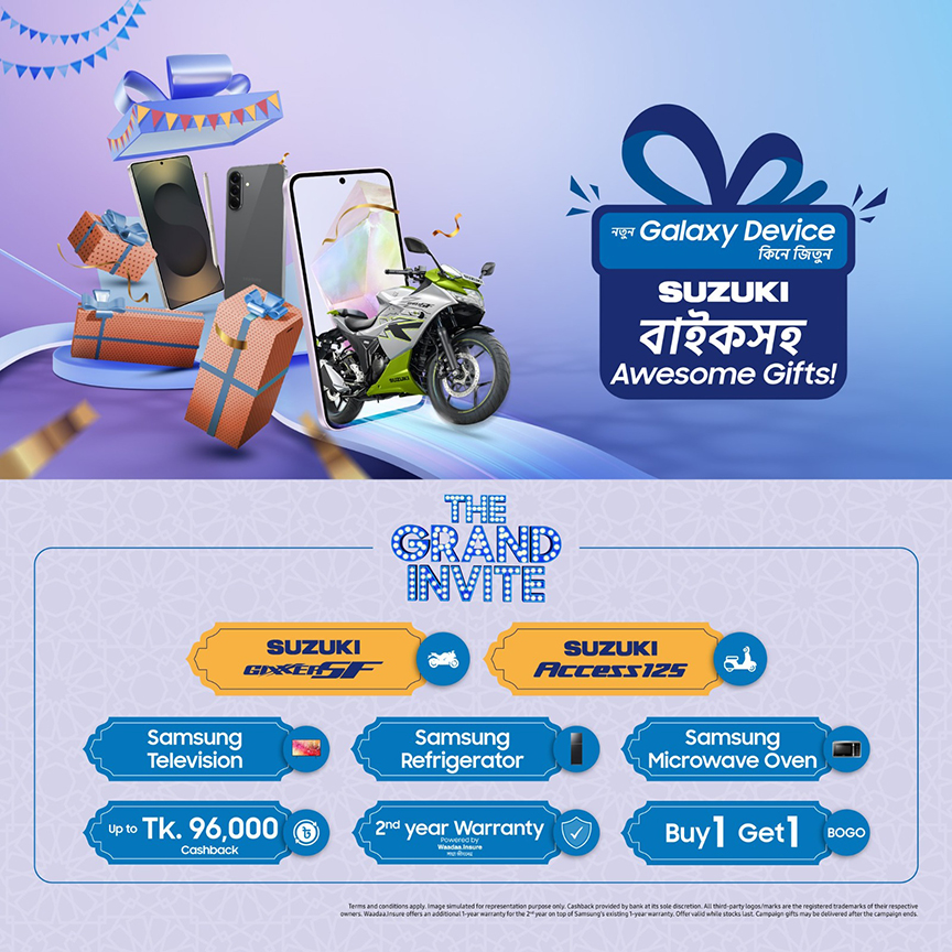 ঈদ-উল-আজহা উপলক্ষে বিশেষ ক্যাম্পেইন ‘দ্য গ্র্যান্ড ইনভাইট’ নিয়ে এসেছে স্যামসাং, যেখানে থাকছে দারুণ সব উপহার ও অফার। এর আওতায় গ্রাহকেরা নির্বাচিত স্যামসাং ডিভাইসে সর্বোচ্চ ৯৬,০০০ টাকা ক্যাশব্যাক পাবেন। এ ছাড়াও থাকছে ‘বাই ওয়ান গেট ওয়ান’ ডিল এবং আকর্ষণীয় পুরস্কার– যেমন স্যামসাং টিভি, রেফ্রিজারেটর, মাইক্রোওয়েভ ওভেন, এমনকি নতুন সুজুকি মোটরসাইকেল (সুজুকি জিক্সার এস এফ বা সুজুকি এক্সেস ১২৫) জেতার সম্ভাবনা। এক সংবাদ বিজ্ঞপ্তিতে এসব তথ্য জানানো হয়।