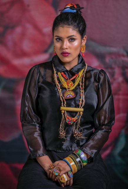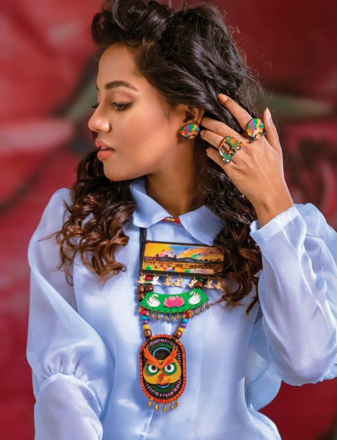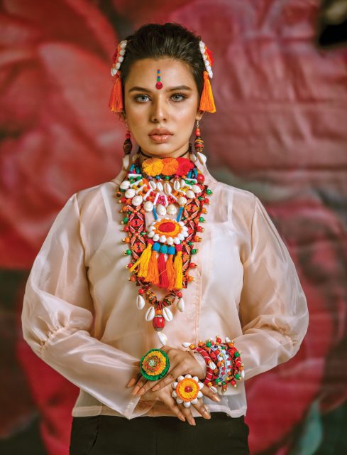 বুনো শিকড়ের গন্ধমাখা গয়না। বাঁশ ও কাঠে মূল কাঠামো তৈরি। তাতে পাটের দড়ি আর রঙবেরঙের পুঁতির কাজ। উৎসবের লোকজ আমেজ। সমকালীনতাকে সঙ্গী করে।