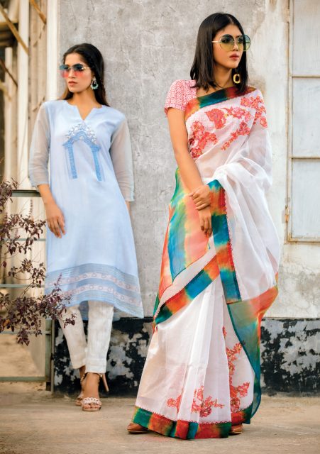 রিঅ্যাকটিভ ডাই করা সাদা সুতি শাড়ি। জমিনজুড়ে রঙবেরঙের ডটেড ডিজাইন