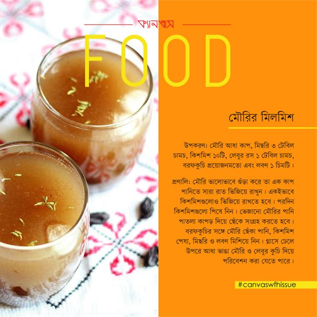 উপকরণ: মৌরি আধা কাপ, মিছরি ৩ টেবিল চামচ, কিশমিশ ১০টি, লেবুর রস ১ টেবিল চামচ, বরফকুচি প্রয়োজনমতো এবং লবণ ১ চিমটি।