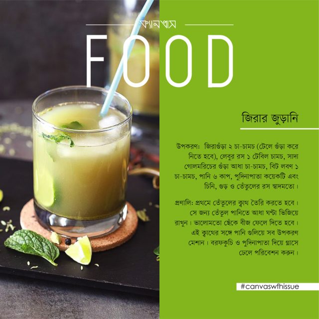উপকরণ: জিরাগুঁড়া ২ চা-চামচ (টেলে গুঁড়া করে নিতে হবে), লেবুর রস ১ টেবিল চামচ, সাদা গোলমরিচের গুঁড়া আধা চা-চামচ, বিট লবণ ১ চা-চামচ, পানি ৬ কাপ, পুদিনাপাতা কয়েকটি এবং চিনি, গুড় ও তেঁতুলের রস স্বাদমতো।