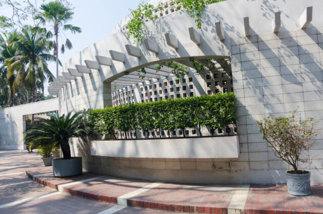 কোনো প্লাস্টারের ব্যবহার নেই এই প্রাঙ্গণে। কংক্রিট ব্লক রাখা হয়েছে প্রকৃতির সঙ্গে সামঞ্জস্য সৃষ্টির জন্য। এক্সপোজড ম্যাটেরিয়াল বা কংক্রিটের ইট আর শেল সাইটে তৈরি করে ব্যবহার করা হয়েছিল। বিশুদ্ধ আকার, উপকরণ আর স্থাপত্যিক ধারণার দিক থেকে এটা কখনো পুরোনো হবে না, কেবল এর শরীর ধুলেই হয়ে যাবে, আবার সময়ের সঙ্গে এর এজিংও হবে- এইটাই ছিল মূল ধারণা।