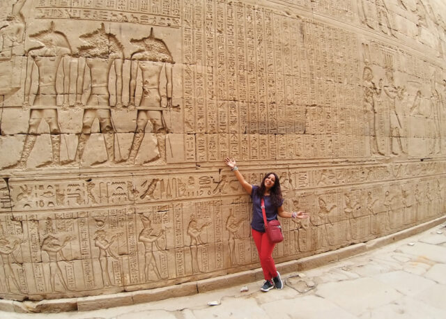 মন্দিরের ওপরে ওঠার সিঁড়িগুলো নতুন করে পাথর কেটে বানানো হয়েছে। নিচের চত্বরে দেয়ালে ও পিলারে পাথর কেটে আঁকা ছবিগুলো উপভোগ করলাম। গাইড মোহাম্মদ হায়ারোগ্লিফিকস দেখিয়ে আমার পরীক্ষা নিচ্ছিলেন। নাইল ক্রুসে বন্দরে বন্দরে ঘুরে তিনি গড়গড় করে যেসব ইতিহাস বলছিলেন, সেগুলো আমার মনে আছে কি না, বোঝার চেষ্টা করছিলেন।