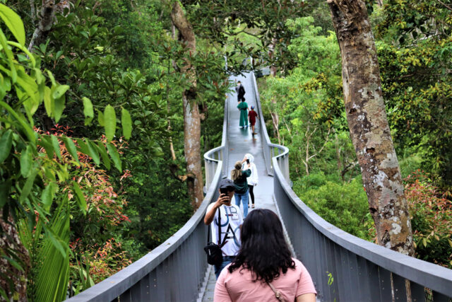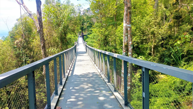 এই জায়গাতে অনেকটা সময় কাটালাম। কারণ, গভীর বনানীর মাঝখানে এমন দীর্ঘ সেতুতে ভ্রমণের সুযোগ মেলা ভার। সেতুর নিচের খাদে জন্ম নেওয়া প্রাচীন সব বৃক্ষ নজরে পড়ল। আমাদের মাথার অনেক ওপর পর্যন্ত উঠে গেছে। সেতুতে আরও অনেক পর্যটক ঘোরাফেরা করছেন। কেউ দাঁড়িয়ে ছবি তুলছেন। সেতুতে দাঁড়িয়ে একটু দূরে পেনাং হিলের গভীর জঙ্গলাবৃত পাহাড় দেখা যাচ্ছে। সহজেই বোঝা যায়, শতবর্ষী বহু বৃক্ষ এখানকার অরণ্যে বহাল তবিয়তে টিকে রয়েছে।