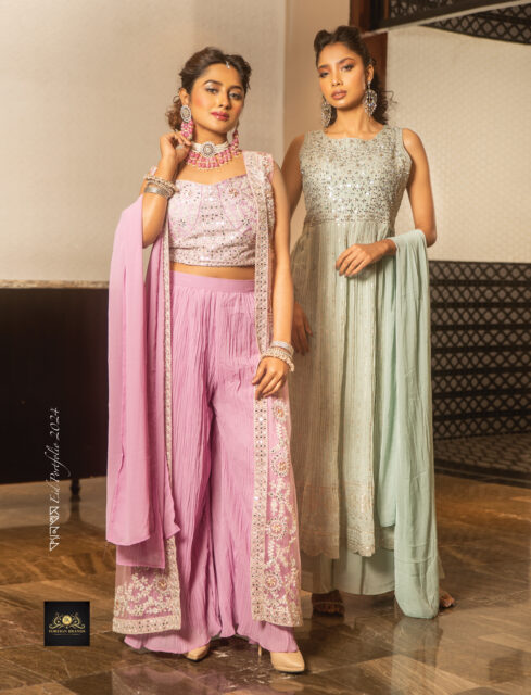 গোটাপাত্তি ওয়ার্কের ক্রপটপ। সঙ্গে ফ্লেয়ারড বটম আর সিকুইন এমব্রয়ডারড স্লিভলেস লং কটি
