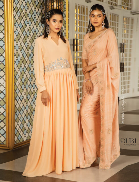 ফ্লোর লেন্থ লং ড্রেসের আপার পার্ট অ্যাসিমেট্রিক, তাতে এমব্রয়ডারির এমবেলিশমেন্ট। লোয়ার পার্টে অলওভার কারচুপির কাজ আর ভারী ওয়ার্কের হেমলাইন
