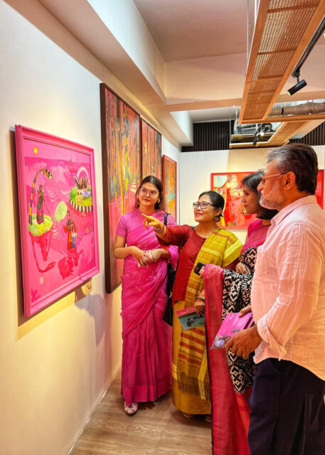 বারিধারার প্রগতি সরণির প্ল্যাটফর্মস গ্যালারিতে ঢুঁ মেরে দেখা মেলে থরে থরে সাজানো গোলাপি রঙের প্রাধান্যে আঁকা চিত্রমালার। তাতে জলবায়ু পরিবর্তনের নেতিবাচক প্রভাব বাংলাদেশের জনজীবনে পড়ার আপাতদৃষ্টে মৃদু অথচ অন্তর্নিহিতভাবে ধারালো প্রতিচ্ছবি ছড়িয়ে পড়ে। বলছি প্ল্যাটফর্মসের আয়োজনে প্রতিশ্রুতিশীল চিত্রশিল্পী অন্তরা মেহরুখ আজাদের একক শিল্পকর্ম প্রদর্শনী ‘সোলাস্ট্যালজিয়া: ফ্র্যাগমেন্টস অব আ ফেডিং হরাইজন’-এর কথা। উদ্বোধন হয় ১৯ অক্টোবর। চলবে ১৬ নভেম্বর পর্যন্ত। প্রতিদিন সকাল ১১টা থেকে রাত ৮টা। শিল্পীর অন্তর্দৃষ্টির ভেতর দিয়ে ধরা পড়া পরিবেশগত পরিবর্তনের ব্যক্তিগত ও সর্বজনীন অভিজ্ঞতার সন্ধান চালিয়ে, বাংলাদেশে নদী ও ল্যান্ডস্কেপের সঙ্গে গভীর সংযোগ ঘটানোর প্রতিনিধিত্ব করে এই প্রদর্শনী। জলবায়ু প্ররোচিত বন্যার প্রভাব এবং গ্রামীণ ও শহুরে পরিবেশের মধ্যে উত্তেজনাকে অন্বেষণ করে শিল্পকর্মগুলো। সুন্দরবন থেকে ঢাকার ঘন শহুরে ফ্যাব্রিক পর্যন্ত, অন্তরার কাজগুলো এই জগতের সংমিশ্রণের প্রতিফলন ঘটিয়ে, মানুষের কার্যকলাপ ও পরিবেশগত সংকটের মাধ্যমে পুনর্নির্মাণ করা একটি ল্যান্ডস্কেপের বাহ্যিক পর্যবেক্ষণের সঙ্গে অভ্যন্তরীণ আবেগকে একাকার করে দেয়। অন্তরা বলেন, ‘২০১৮ সালে একটি গুরুত্বপূর্ণ মুহূর্ত এসেছিল, যখন আমি পাকুরিয়ায় বন্যাকবলিত জনগোষ্ঠীর সঙ্গে কাজ করেছি। আমার কাজের নিয়ন গোলাপি জল এই সংকটের অস্বাভাবিক মনুষ্যসৃষ্ট উপাদানগুলোর প্রতিনিধিত্ব করে, যা জলবায়ু পরিবর্তনের কারণে বেড়েছে।’ প্রদর্শনীটির কিউরেটর রায়ানা হোসেন।