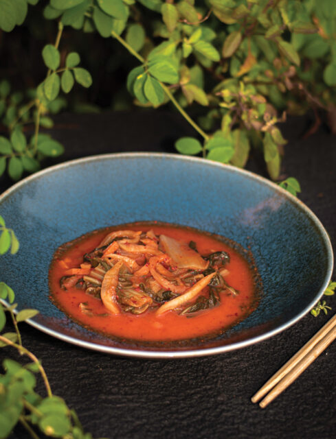 এবার একটি বাটিতে ভিনিগার, সয়া সস, লাল মরিচের গুঁড়া, কাশ্মীরি মরিচের গুঁড়া, ব্রাউন সুগার, তিলের তেল, অলিভ অয়েল, টমেটো সস ও লবণ নিয়ে ভালো করে মিশিয়ে, একটি মিক্সিং জারে ঢেলে ব্লেন্ড করে নিন। তারপর পানি ঝরানো বাঁধাকপি ও মুলা একটি বাটিতে নিয়ে এতে কোরানো গাজর, পেঁয়াজ কলি কুচি, রসুনকুচি, আদাকুচি মিশিয়ে নিন। তারপর এতে সসের সেই মিক্সচার যোগ করে সিজলিং করুন। এরপর এই স্যালাদকে ফারমেন্টেশনের জন্য ২৪ ঘণ্টা রেখে দেওয়া চাই। তারপর পরিবেশন করুন।