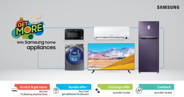 প্রয়োজনীয় সব হোম অ্যাপ্লায়েন্স নিয়ে আরও সহজভাবে গ্রাহকদের কাছে পৌঁছে যেতে বিশ্বখ্যাত ইলেকট্রনিকস ব্র্যান্ড স্যামসাং নিয়ে এসেছে ‘গেট মোর’ ক্যাম্পেইন। এ ক্যাম্পেইনের আওতায় গ্রাহকেরা ডিসেম্বরের শেষ পর্যন্ত তাদের পছন্দের পণ্যের ওপর সর্বোচ্চ ২২,০০০ টাকা পর্যন্ত এক্সচেঞ্জ অফার এবং ৩০,০০০ টাকা পর্যন্ত ক্যাশব্যাক উপভোগ করতে পারবেন।