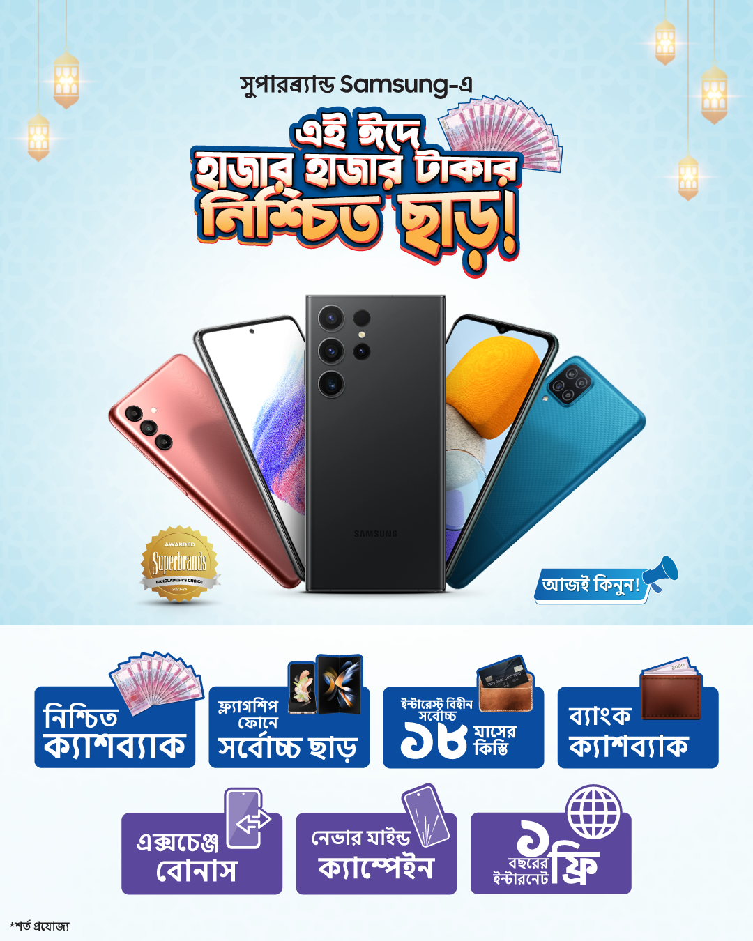 এই ঈদে ফ্যানদের পছন্দের স্মার্টফোনের ক্ষেত্রে ১৫,০০০ টাকা পর্যন্ত ক্যাশব্যাকের সুযোগ নিয়ে এসেছে স্যামসাং। পাশাপাশি, নির্দিষ্ট ব্যাংকের কার্ডে ১৮ মাস ইএমআইয়ের ক্ষেত্রে রয়েছে ৫,০০০ টাকা পর্যন্ত ছাড়ের সুযোগ, এতে করে প্রযুক্তিপ্রেমী মানুষ এখন আরও সহজে স্যামসাংয়ের অভাবনীয় উদ্ভাবনের সঙ্গী হওয়ার সুযোগ পাবেন। এর সাথে, ঈদ উদযাপনকে অনন্য উচ্চতায় নিয়ে যেতে স্যামসাং চালু করেছে ‘নেভার মাইন্ড’ ক্যাম্পেইন। স্যামসাংয়ের এই ক্যাম্পেইনে রয়েছে ফোন কেনার এক বছরের মধ্যে অনাকাঙ্ক্ষিতভাবে স্ক্রিনের কোনো ক্ষতির ক্ষেত্রে স্ক্রিন রিপ্লেসমেন্ট অফার। স্যামসাংয়ের ফ্যানরা এখন তাদের পছন্দের ডিভাইসের স্ক্রিনের ক্ষেত্রে অনাকাঙ্ক্ষিত ক্ষতির দুশ্চিন্তা থেকে নিশ্চিন্ত থাকতে পারবেন। অফারটি গ্যালাক্সি এ০৪এস, গ্যালাক্সি এফ২৩, সদ্য উন্মোচিত গ্যালাক্সি এ৩৪ ফাইভজি, এ৫৪ ফাইভজি ও গ্যালাক্সি এ১৪ ডিভাইসের ক্ষেত্রে প্রযোজ্য হবে।